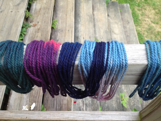 I have a few pictures captured from the workshops I taught and just a smidgen of others. This one is from my first workshop: indigo and pigments. We used fustic for yellow, indigo for blue and cochineal for red. Everyone had several sample skeins and choose which pots they dipped them in.